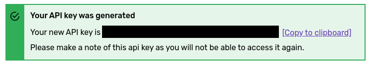 It is possible to have multiple different keys, and deletion of a key is also possible. When a new API key is created, the following view shows up: