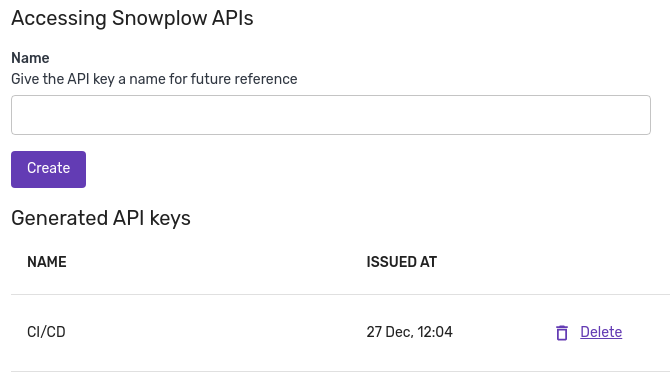 The following view is available in Console, under Settings in the navigation bar, then Manage organization, then API keys for managing Snowplow. Users can view this page only if they have the "view" permission on API keys.