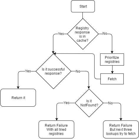 - If registry responded with error other than "NotFound", for example "TimeoutError", "NetworkError", "ServerFault" etc - "needToRetry" value will be cached and Resolver will give this registry 3 chances more. After three failed lookups - "missing" value will be cached