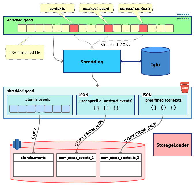 Shredding is the process of splitting a Snowplow enriched event into several smaller chunks, which can be inserted directly into Redshift tables.