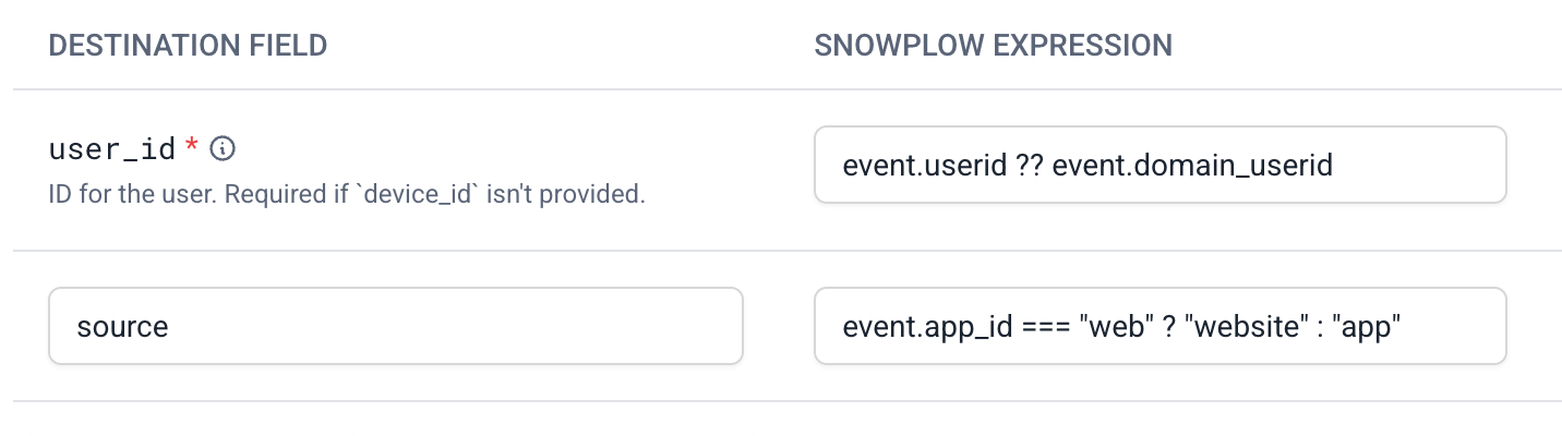 The code snippets below contain JavaScript expressions that you can include in the Snowplow expression mapping field in the UI.