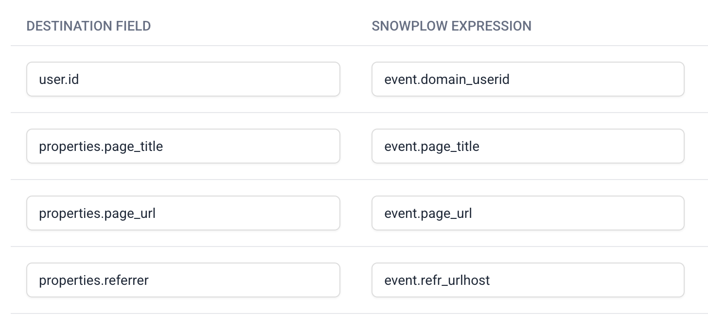Field mapping defines how Snowplow event data is transformed and sent to destination APIs. Each mapping consists of:
