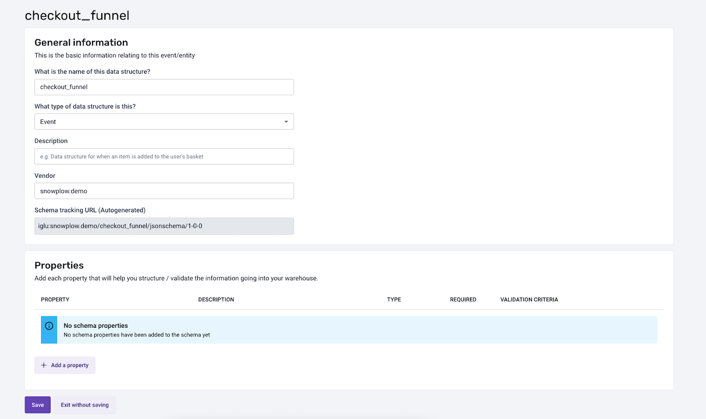 Populate the general information, such as Name, and a Description and Vendor. Vendor allows you to organize your data structures, for example, by teams. Snowplow will automatically generate the Tracking Url to be referenced in your tracking code.
