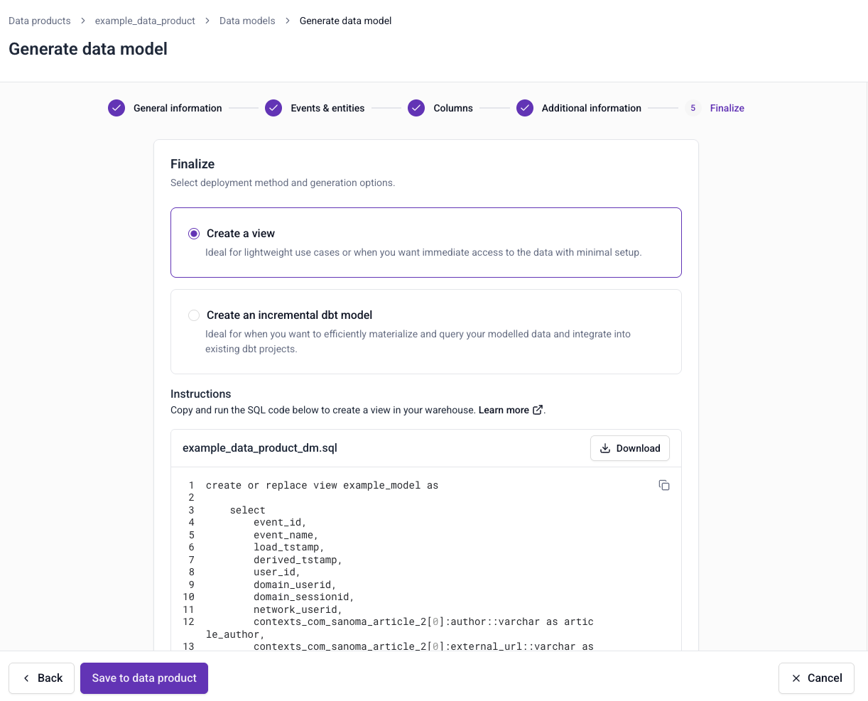 You can choose to create a view or an incremental dbt model.