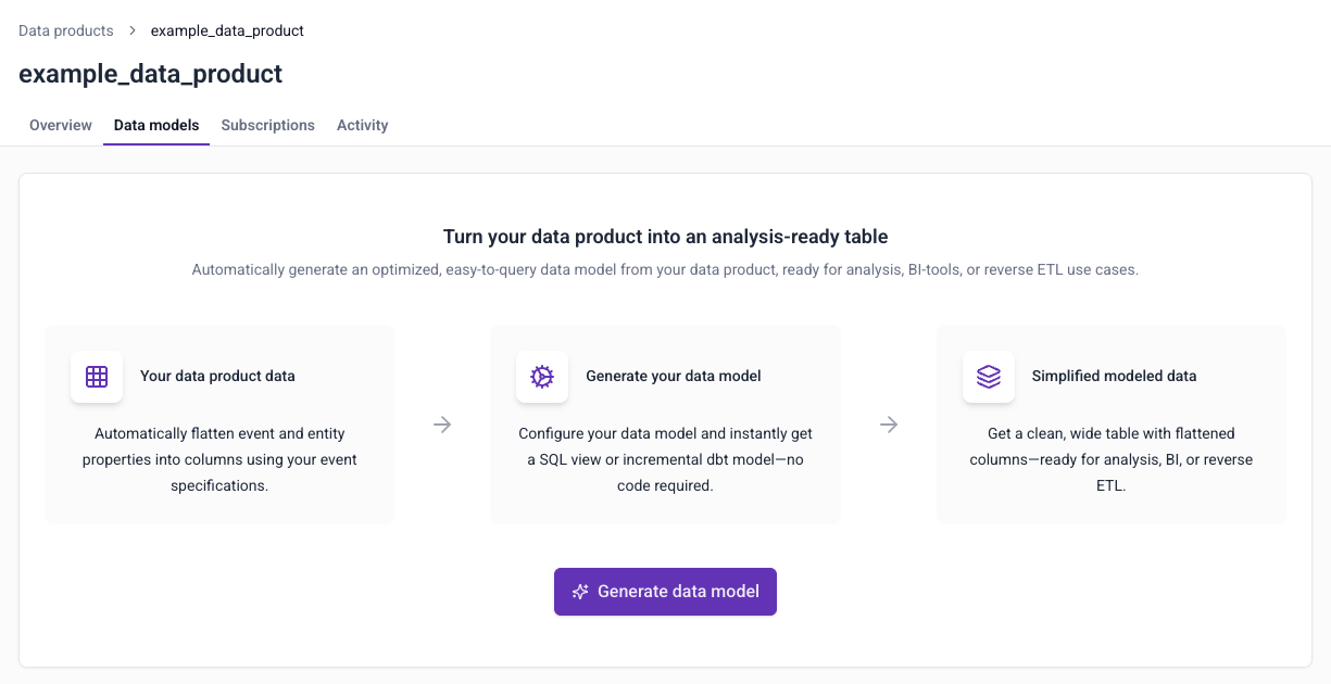 Automatic data model generation allows you to generate optimized models directly from your tracking plans in Snowplow Console. You can use the models directly in your warehouse, or integrate them into existing dbt projects. The models are ready for analysis, BI tool, or reverse ETL use cases.