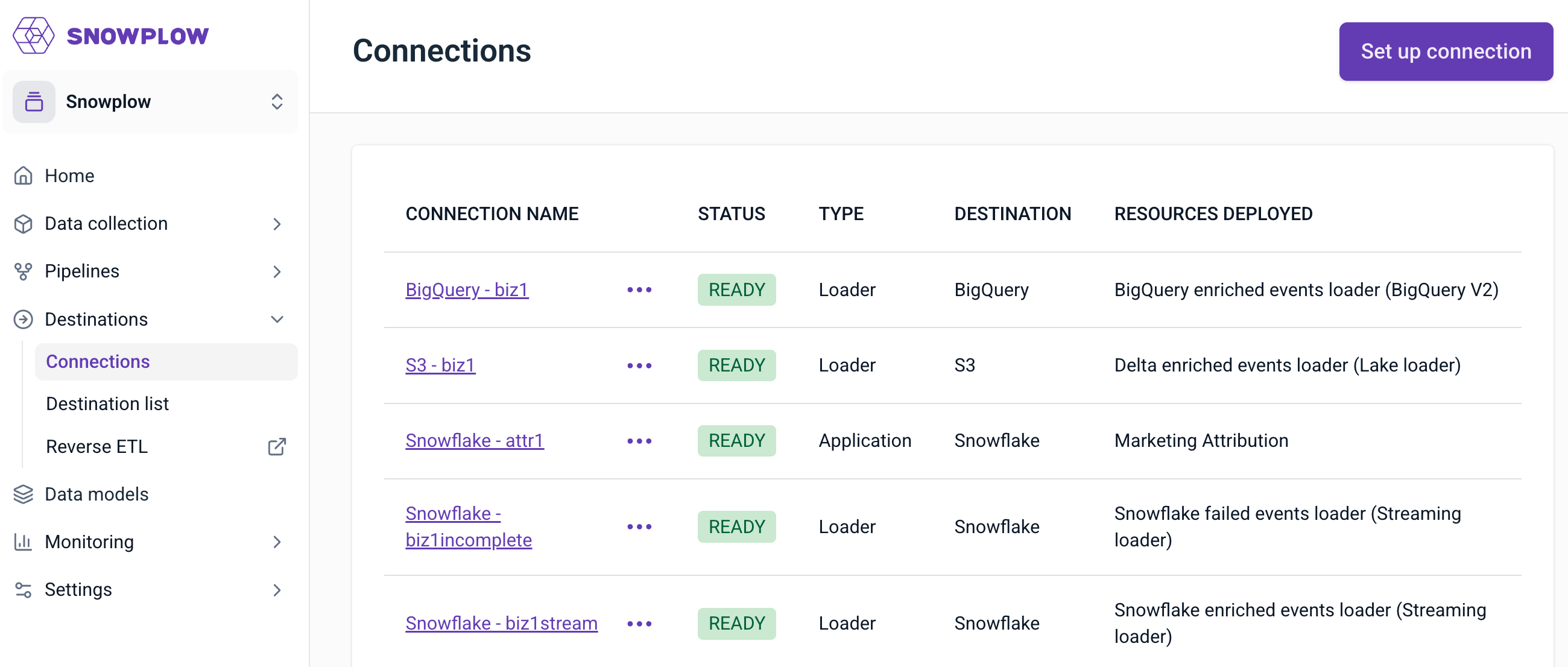 Begin by creating a new warehouse connection. It will be used by a data model to connect to your warehouse. Go to Destinations/Connections, click on "Set up connection", and fill in all the necessary details.