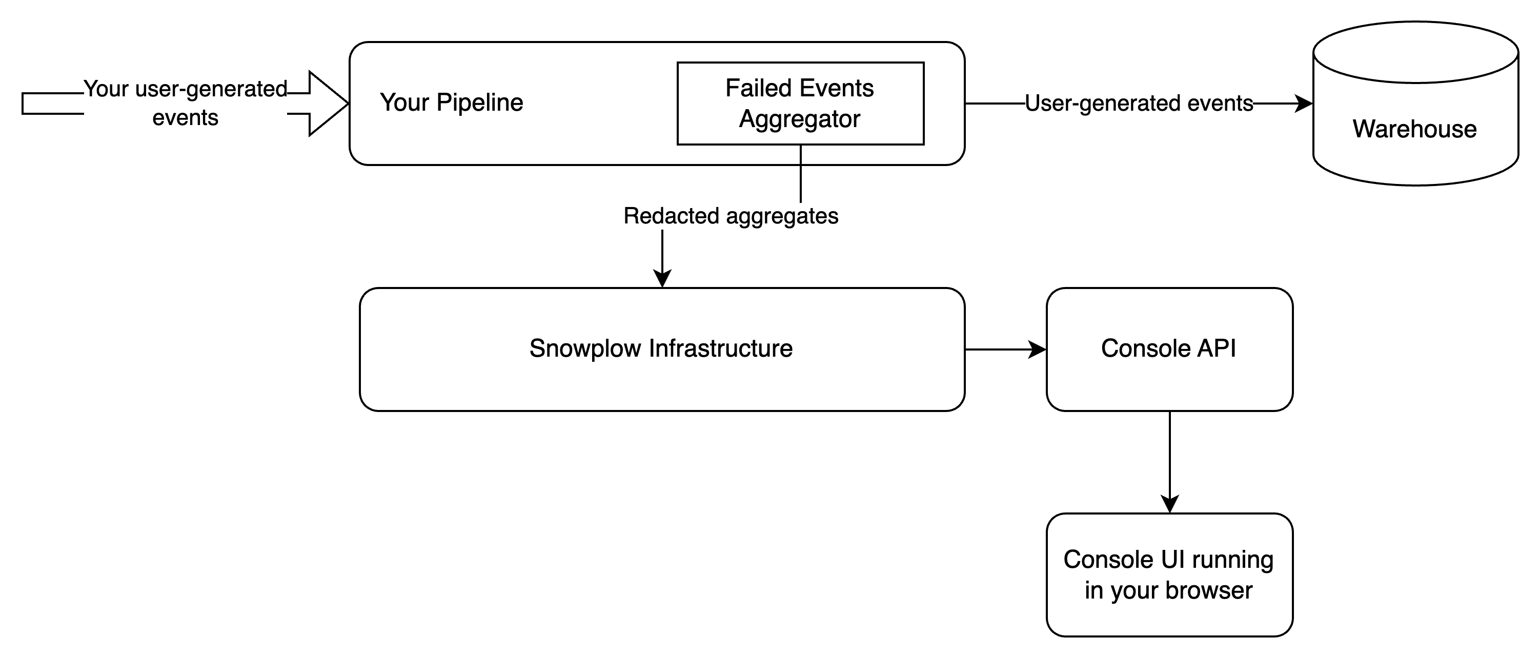The data quality dashboard allows you to see failed events directly from your warehouse. Your browser connects directly to an API running within your infrastructure, such that no failed event information flows through Snowplow. The discussion of architecture is important as it highlights the trade-offs between the two ways of monitoring failed events. The aforementioned API is a simple proxy that connects to your warehouse and serves the failed events to your browser. The connection is fully secure, using an encrypted channel (HTTPS) and authenticating/authorizing via the same mechanism used by Console.