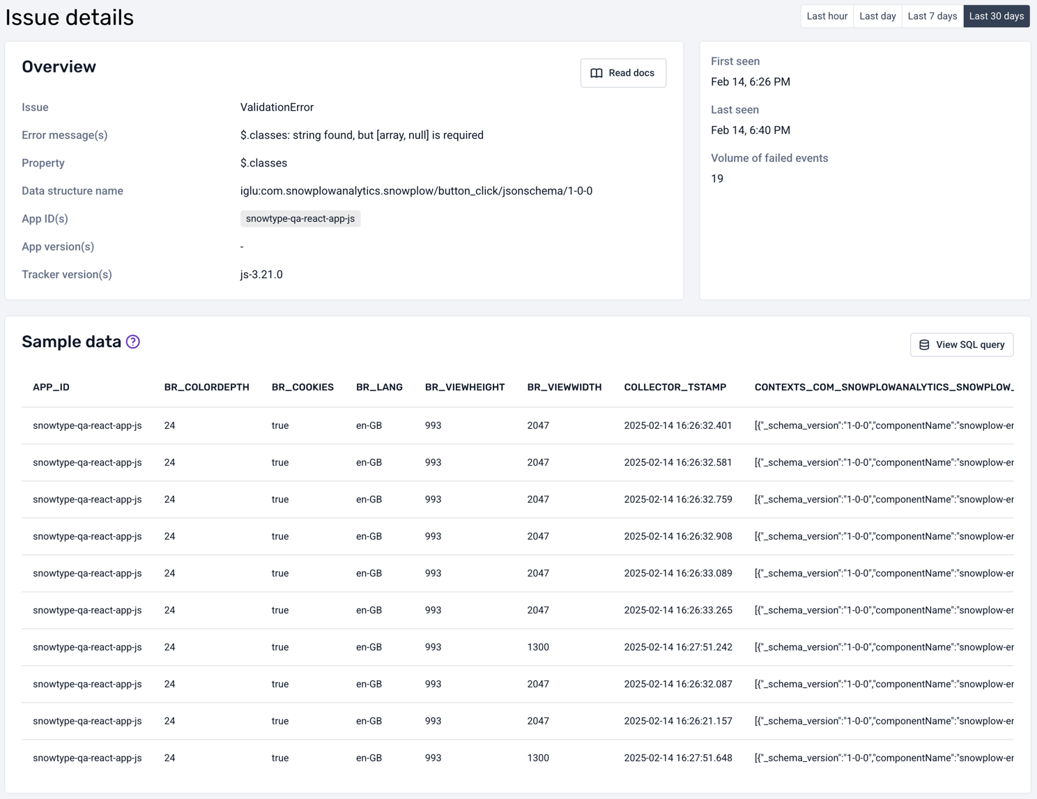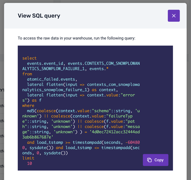 Finally, you can click on the View SQL query button to see the SQL query that was used to fetch the failed events from your warehouse: