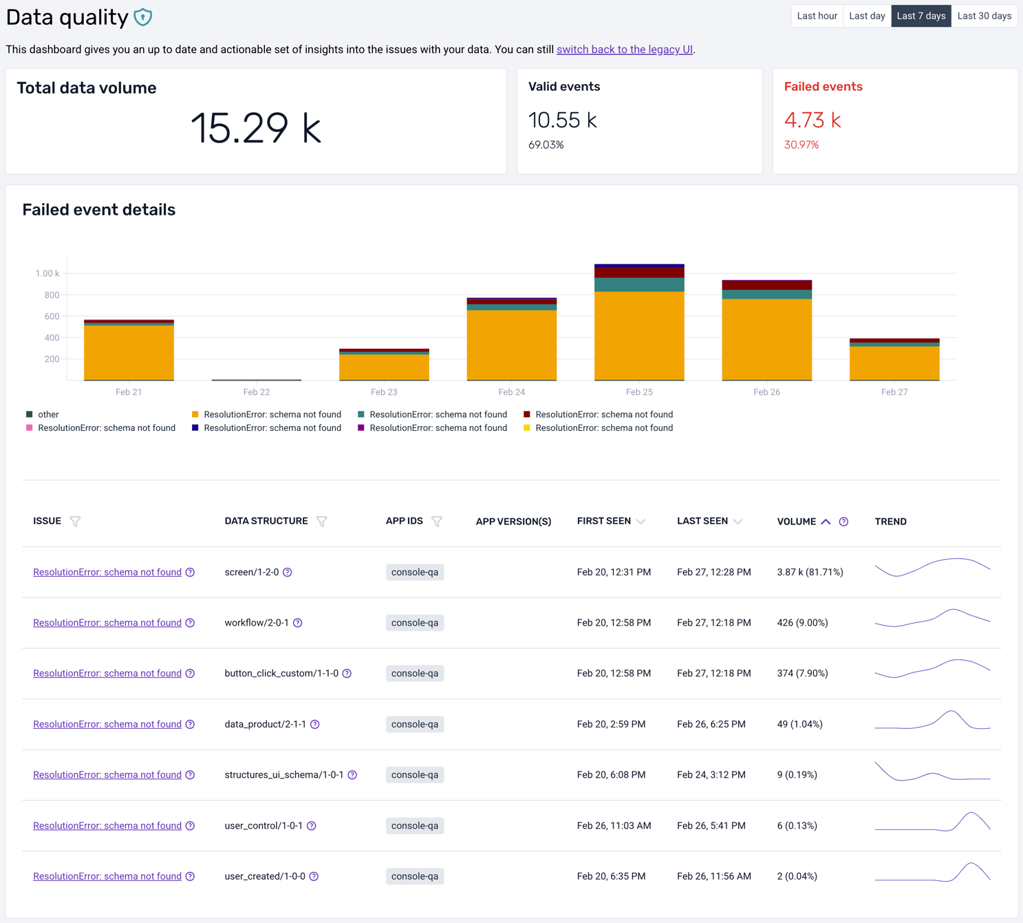 This interface is intended to give you a quick representation of the volume of event failures so that action can be taken. The UI focuses on schema violation and enrichment errors at present.