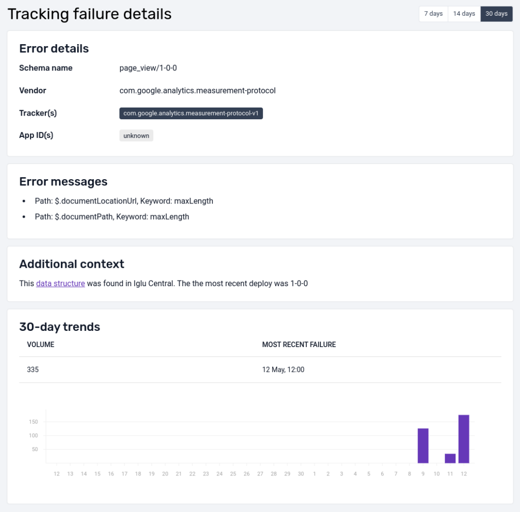 The detailed view shows the error message as well as other useful metadata (when available), like app_id, to help diagnose the source and root cause of the error; as well as a bar chart indicating how the volume of failures varies over time for this particular failed event.