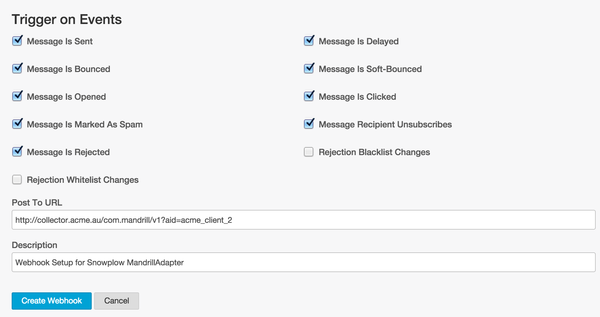 - Please note: 'Rejection Whitelist Changes' & 'Rejection Blacklist Changes' are not supported by the Snowplow MandrillAdapter.