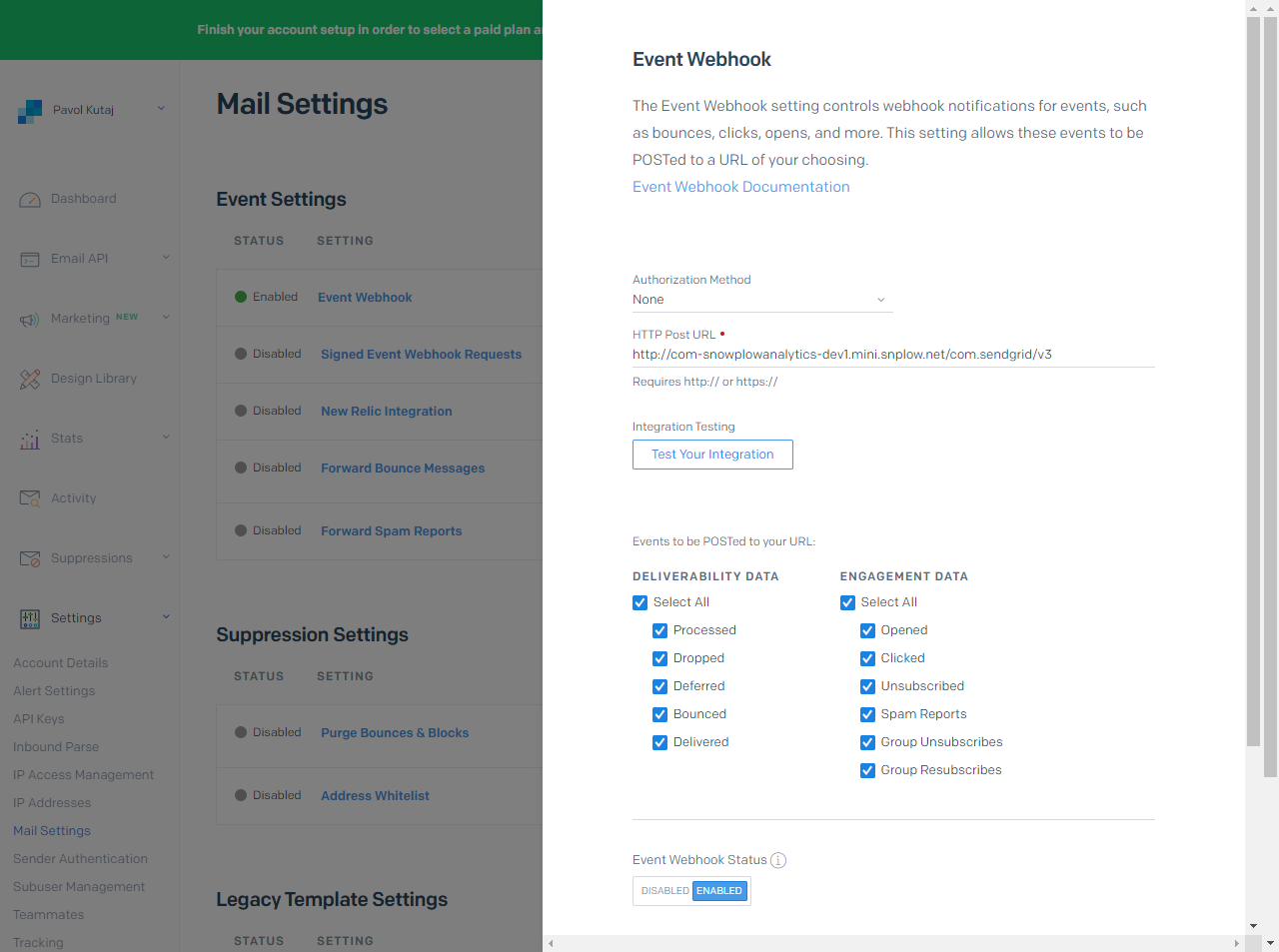 For the HTTP POST URL field you will need to provide the URI to your Snowplow Collector. We use a special path to tell Snowplow that these events are generated by SendGrid: